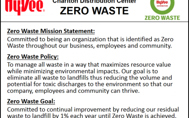 • An in-depth zero waste training module was created and implemented as part of the Hy-Vee Chariton Distribution Center’s annual training program for all site employees.